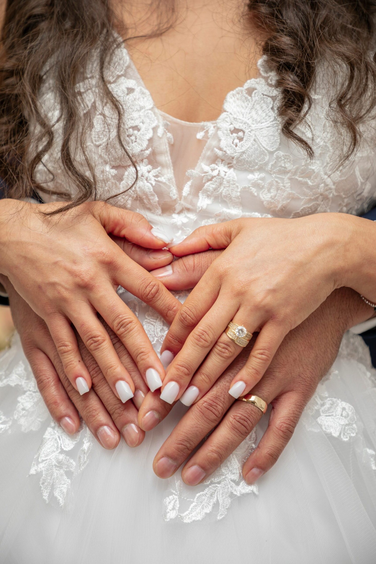 a woman in a wedding dress holding her hands together